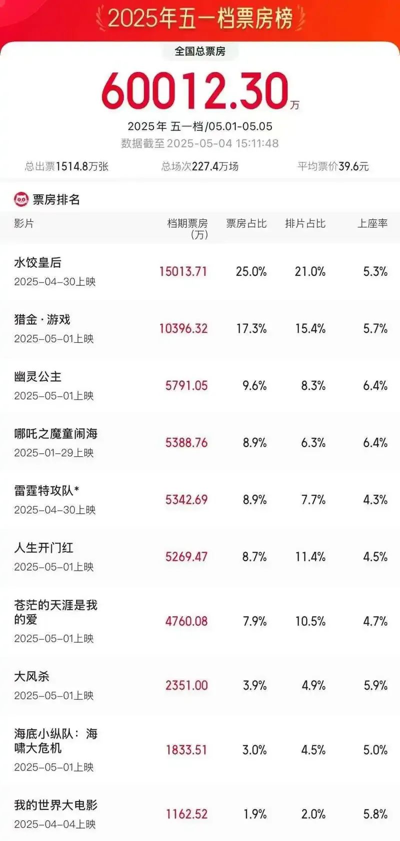 电影消费方面,据灯塔专业版数据,截至5月4日15时11分,2025年五一档(5月1日-5月5日)电影总票房(含预售)破6亿,《水饺皇后》《猎金·游戏》《幽灵公主》分列档期票房榜前三位。